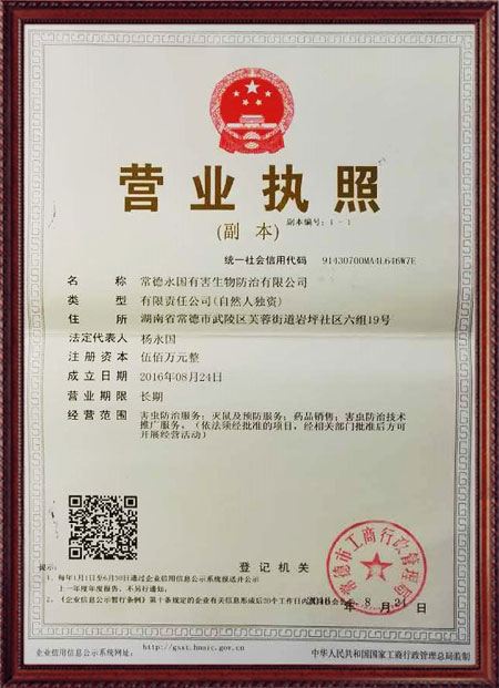 常德永國(guó)有害生物防治有限公司以常德市武陵區(qū)永科清潔服務(wù)中心來(lái)服務(wù),2016年更名為常德永國(guó)生物防治有限公司。做這塊已有十多年豐富的理論支持和實(shí)經(jīng)驗(yàn)。技術(shù)專業(yè)、器械先進(jìn)。旨在為賓館、酒店、超市、餐廳、工礦、機(jī)關(guān)團(tuán)體、學(xué)校、醫(yī)院及家庭提供快捷、貼心的服務(wù),根據(jù)客戶的實(shí)際情況、地理位置,解決鼠、蟲害問(wèn)題。我們承諾:服務(wù)滿意后付款,只要一個(gè)電話解決您的煩惱問(wèn)題。